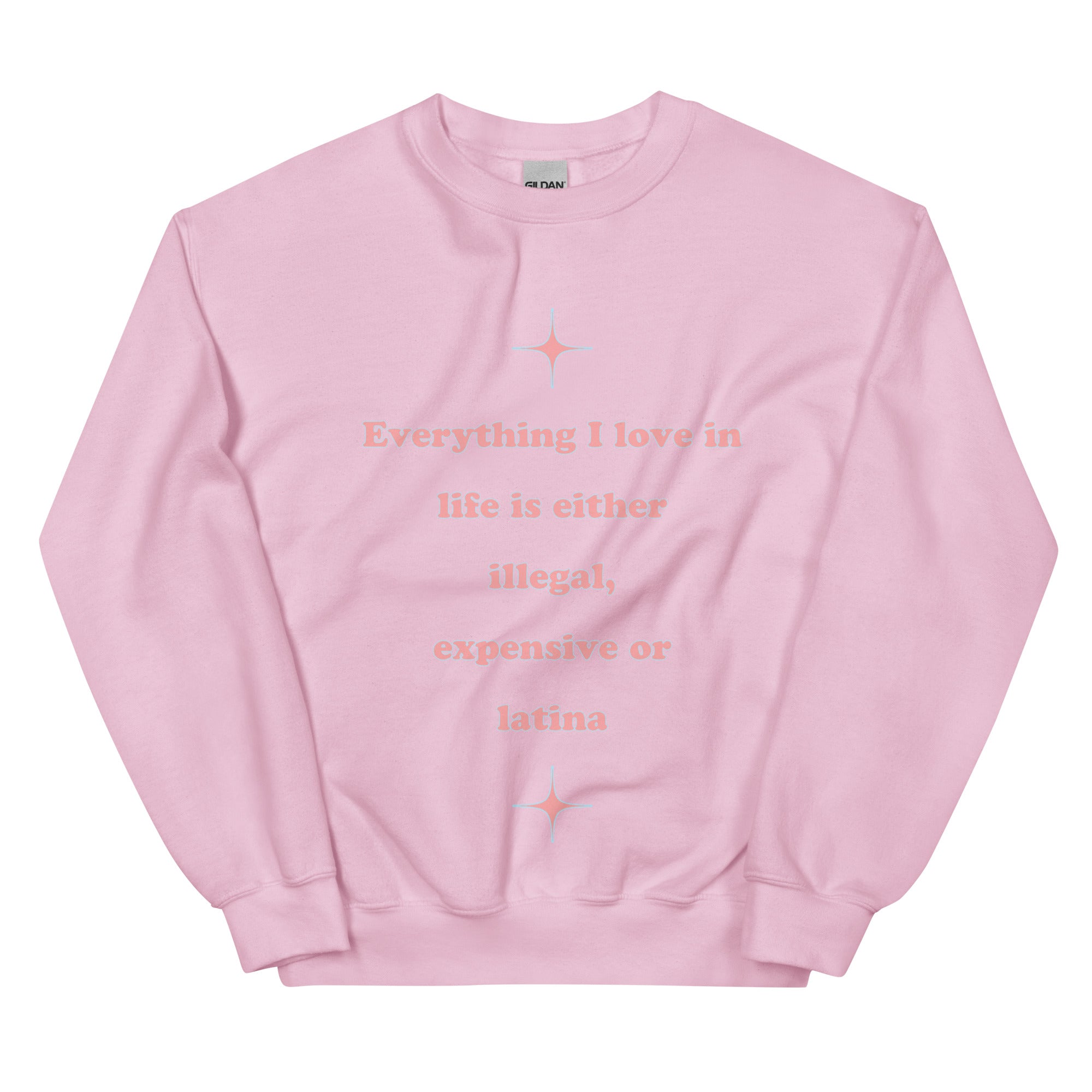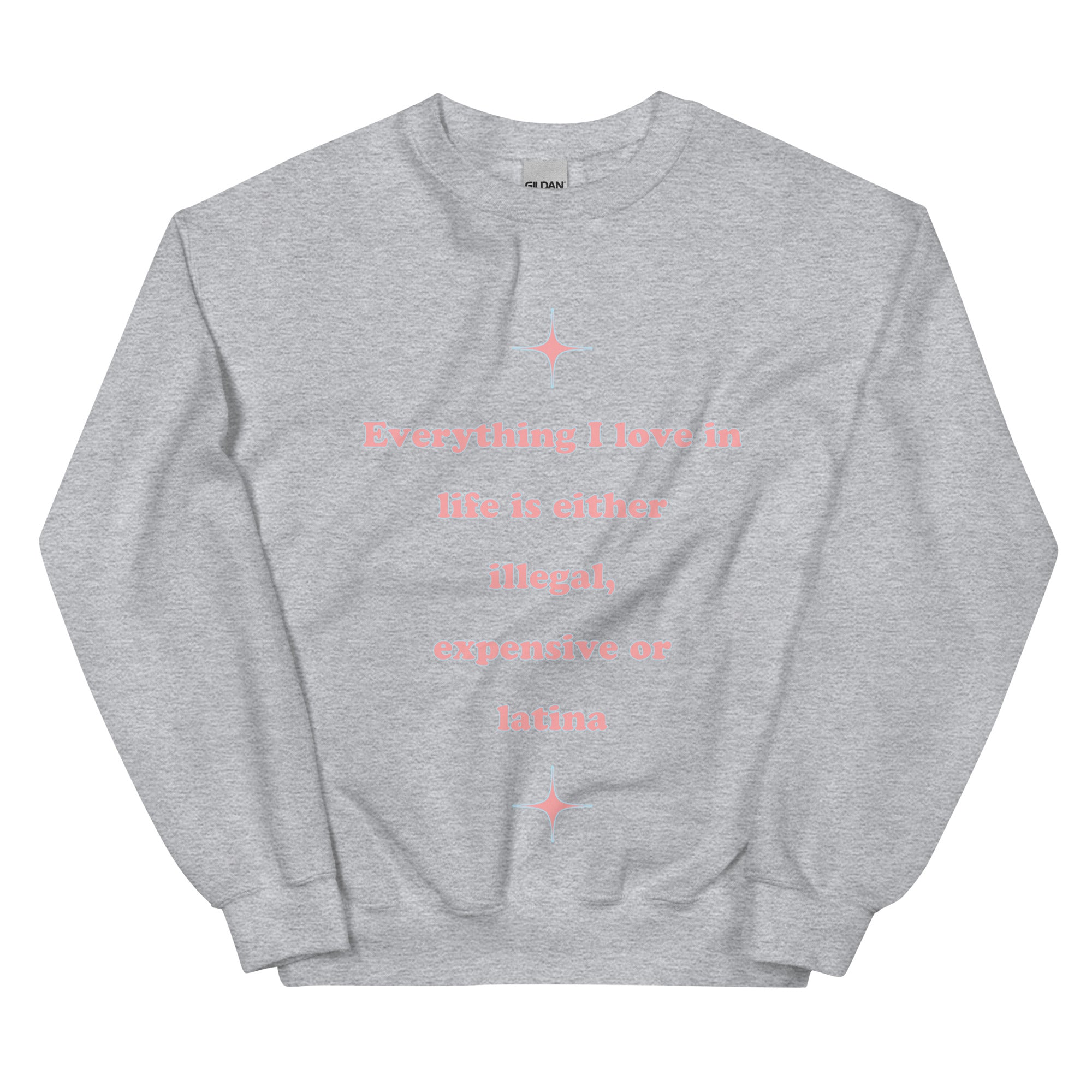 Unser robustes und warmes Sweatshirt mit unserem kultigen „Alles, was ich im Leben liebe, ist entweder illegal, teuer oder Latina“-Print.