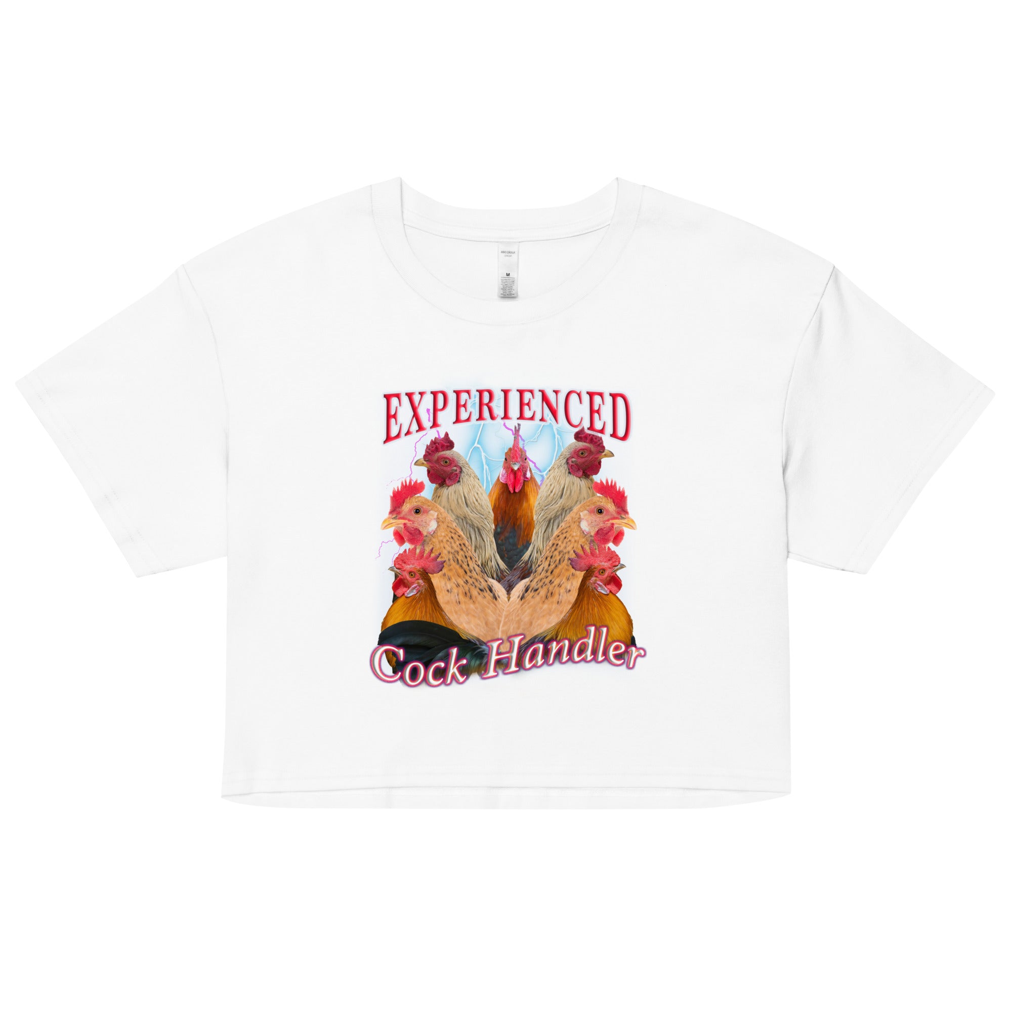 Women’s crop top featuring our iconic Experienced Cock Handler (OG design!) design.