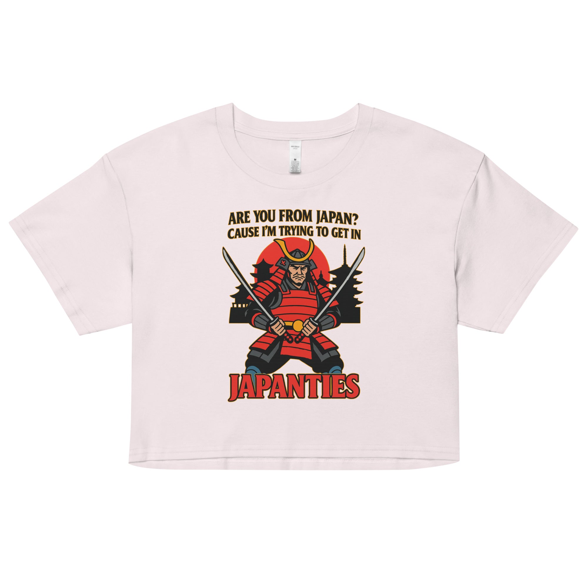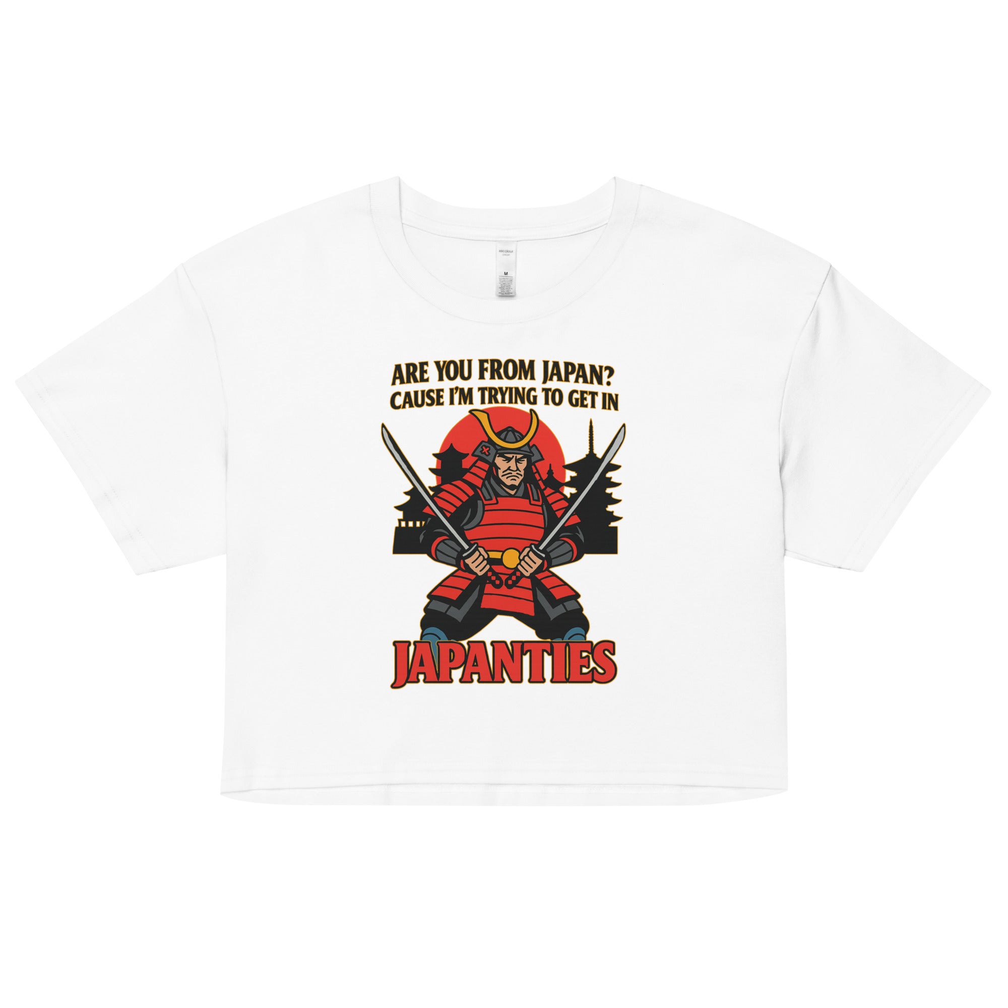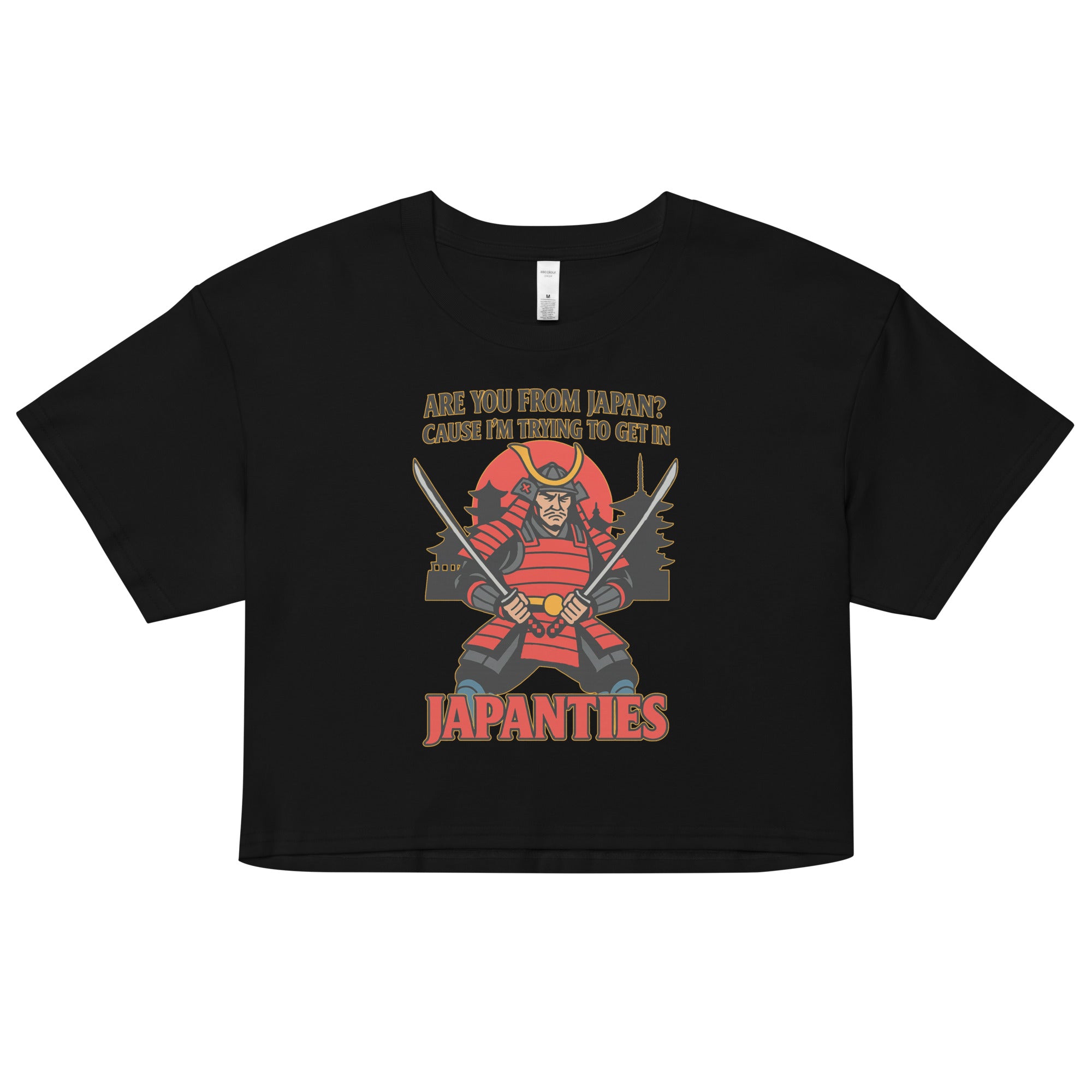 Women’s crop top featuring our iconic Are you from Japan_ Cause I'm trying to get in Japanties design.