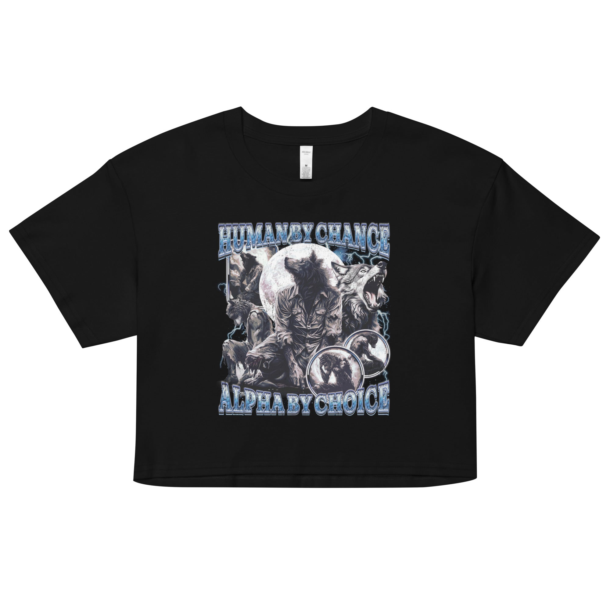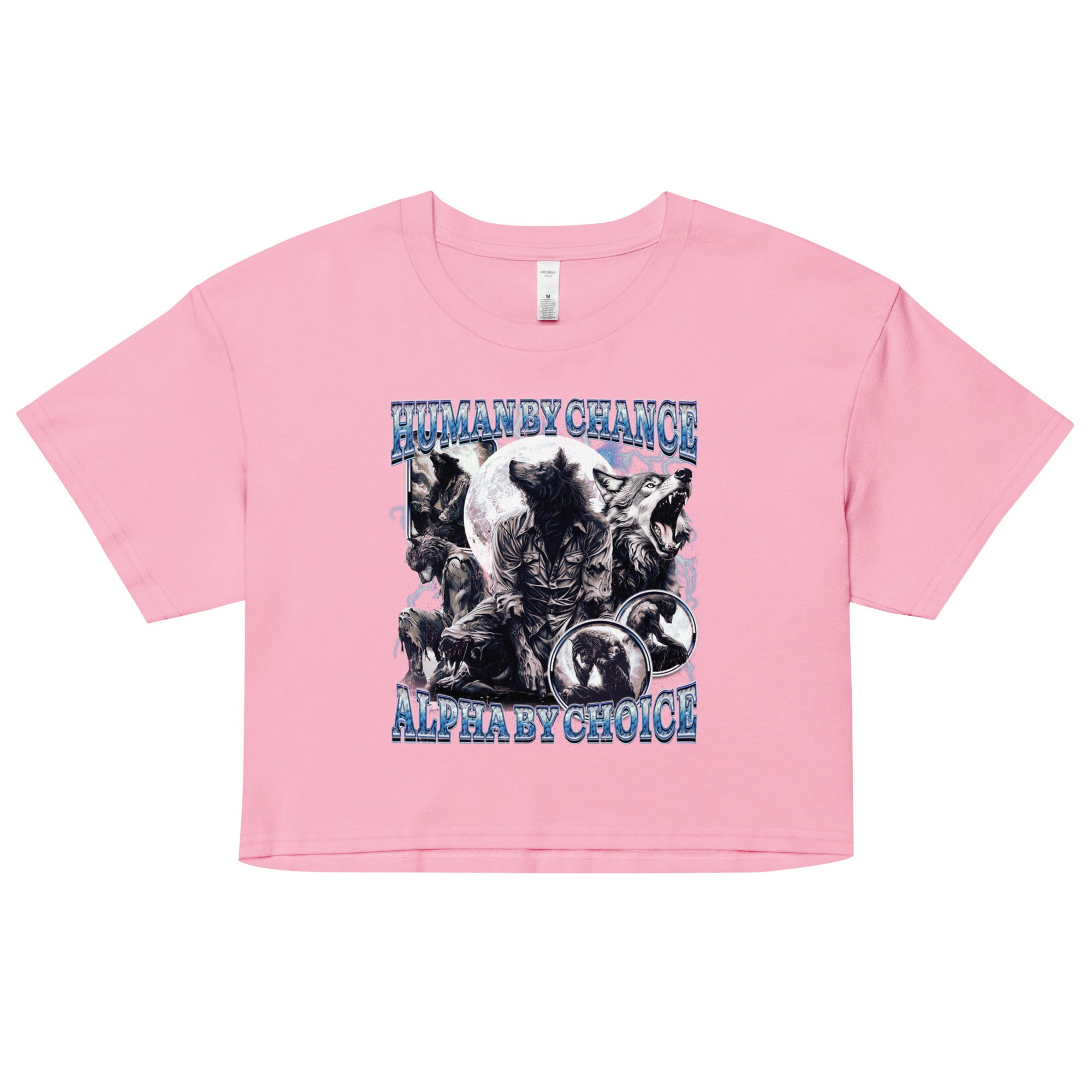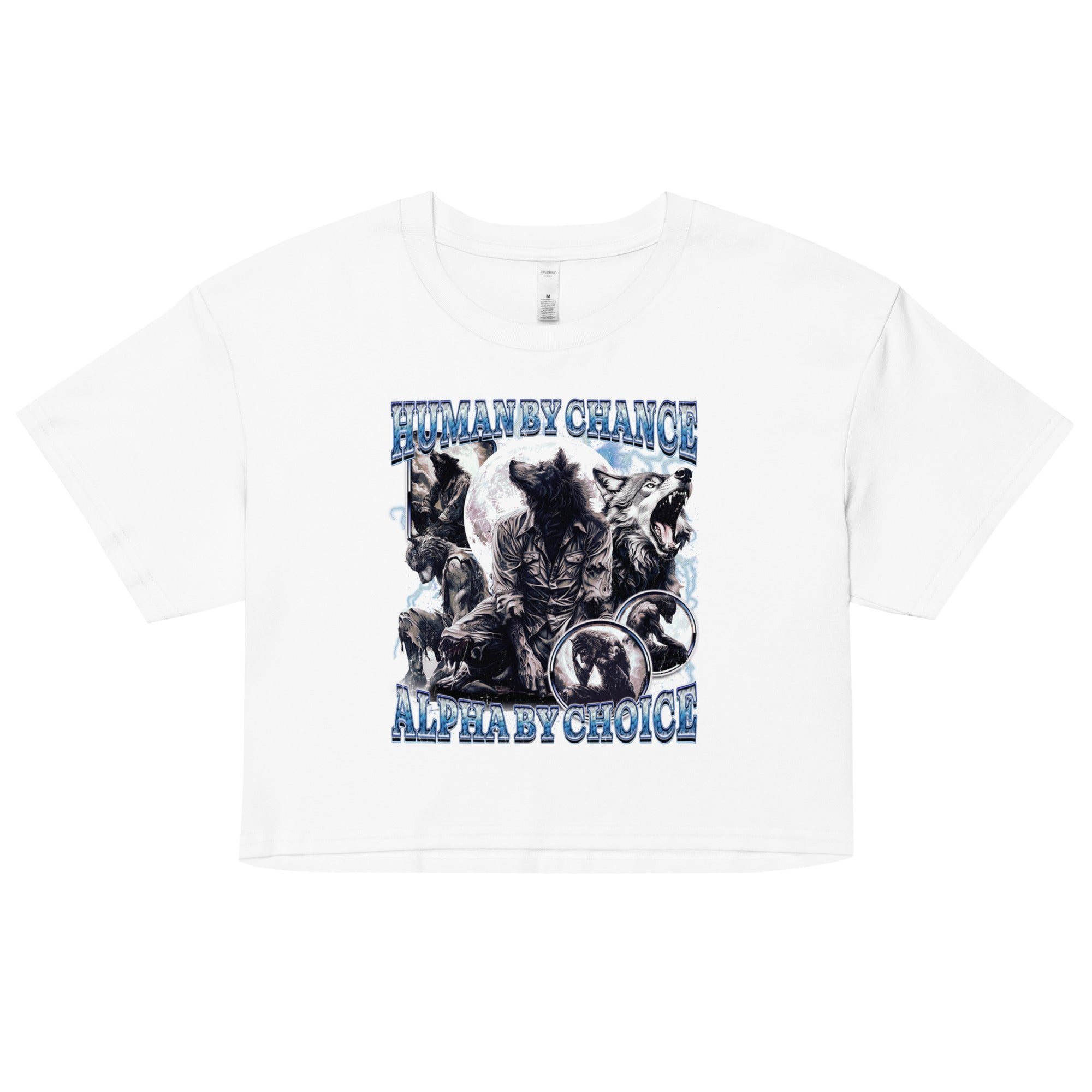 Women’s crop top featuring our iconic Human by Chance Alpha by Choice design.
