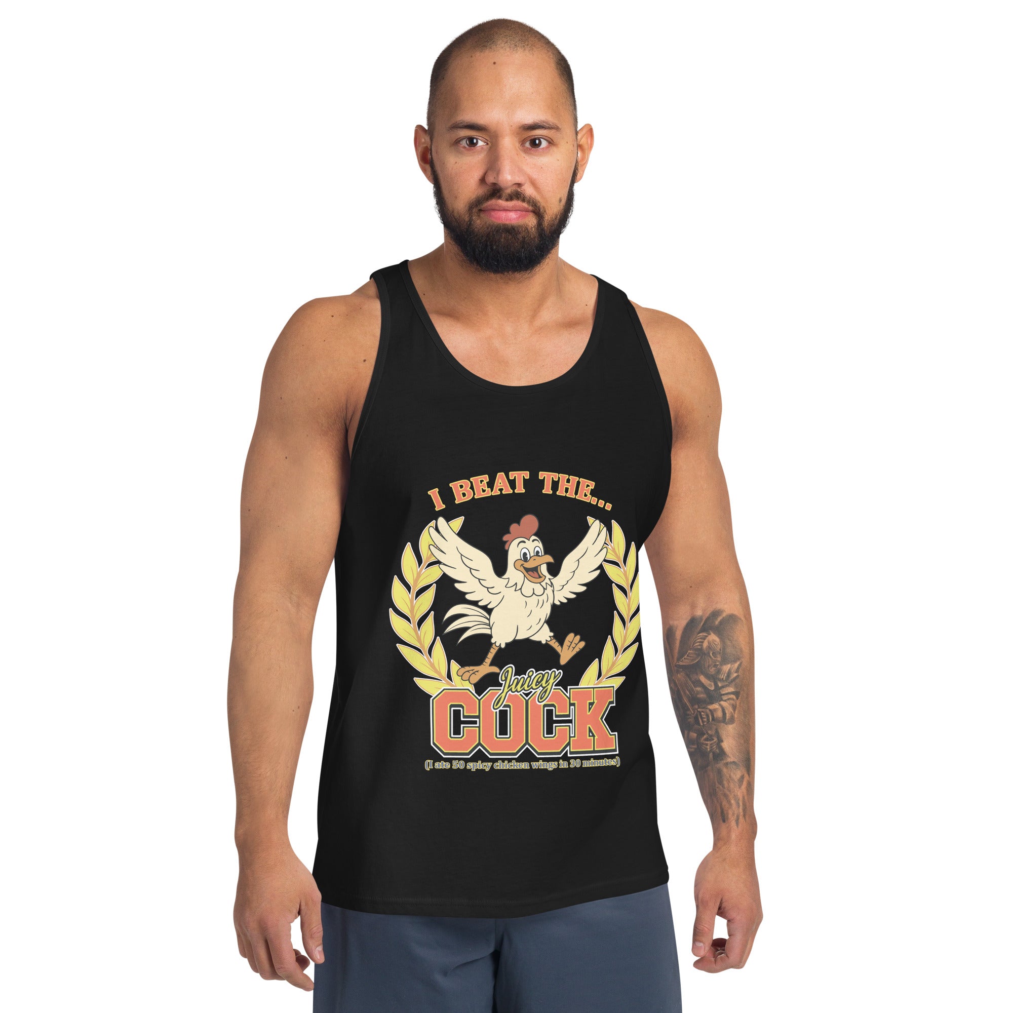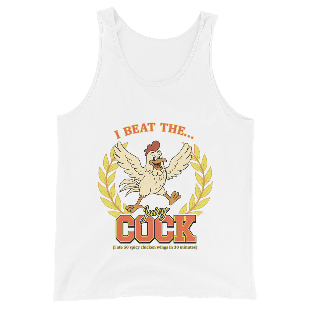 Tank Top featuring our iconic I beat the juicy cock (I ate 50 spicy chicken wings in 30 minutes) design.