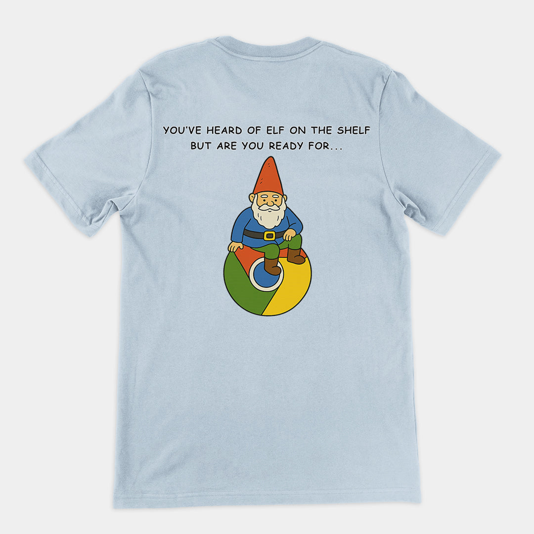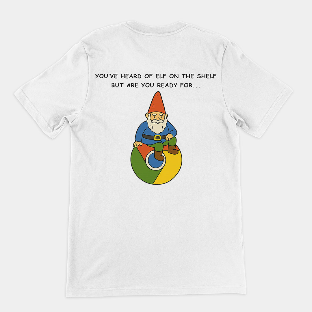 You've heard of elf on the shelf but are you ready for Gnome on Chrome T-Shirt (backprint)